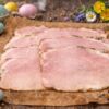 Für den Oster Schinken Kräuterkruste geschnitten 150 g verwenden wir ausgewählte Stücke aus der Schweinekeule. Nach dem Pökeln garen wir das Fleisch besonders schonend, damit es saftig bleibt und eine zarte Struktur behält.